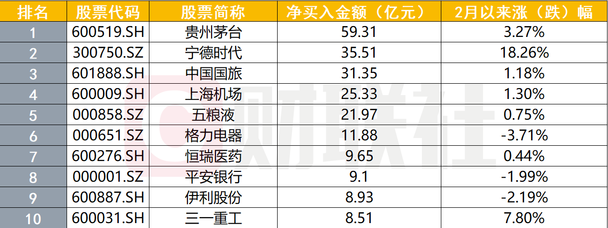 数据显示,近1个月北上资金净买入居前的个股分别贵州茅台、宁德时代、中国国旅、上海机场、五粮液、格力电器、恒瑞医药、平安银行、伊利股份、三一重工。
